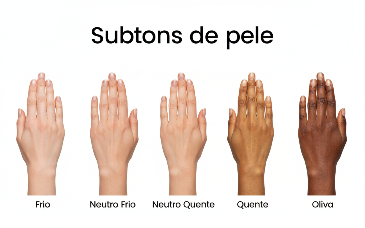 O subtom quente possui nuances amareladas, douradas ou pêssego. Já o subtom frio apresenta reflexos rosados, azulados ou avermelhados. Existe também o subtom neutro, que é o equilíbrio perfeito entre os dois, e o subtom oliva, que tem uma leve base esverdeada. Saber essa definição é essencial, pois o subtom de pele dita quais pigmentos de maquiagem e roupas vão “conversar” melhor com o seu rosto.